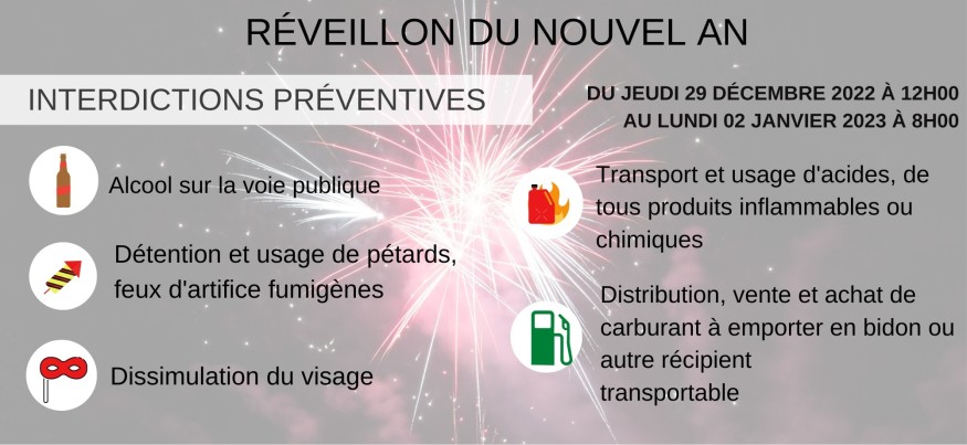 Plusieurs mesures préventives ont été prises par la préfète de l’Ain. Cécile Bigot-Dekeyzer a interdit la consommation d’alcool, la détention de fumigènes, pétards ou feux d’artifice dans la rue. La distribution, la vente et l’achat de carburant en bidon est aussi interdite. Ces mesures sont actives jusqu’au 2 janvier à 8h.