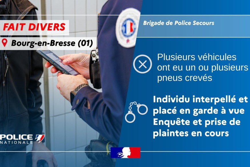 FC Radio - Très mauvaise surprise pour de nombreux automobilistes qui ont retrouvé leur voiture avec un ou plusieurs pneus crevés dans la nuit du dimanche 11 au lundi 12 mai à Bourg-en-Bresse.En fait, les forces de l'ordre ont été prévenues vers 02h30 qu'un individu crevait volontairement les pneus de voitures stationnées avec une perceuse à batterie, cours de Verdun à Bourg-en-Bresse.Cet homme de 39 ans, déjà connu de la justice et qui réside à Bourg-en-Bresse, a pu être interpellé et placé en garde à vue.