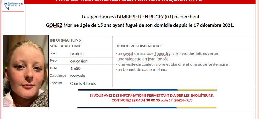 Si vous détenez des informations, merci de contacter la brigade de gendarmerie d'AMBERIEU EN BUGEY au 04 74 38 00 35 ou au 17.